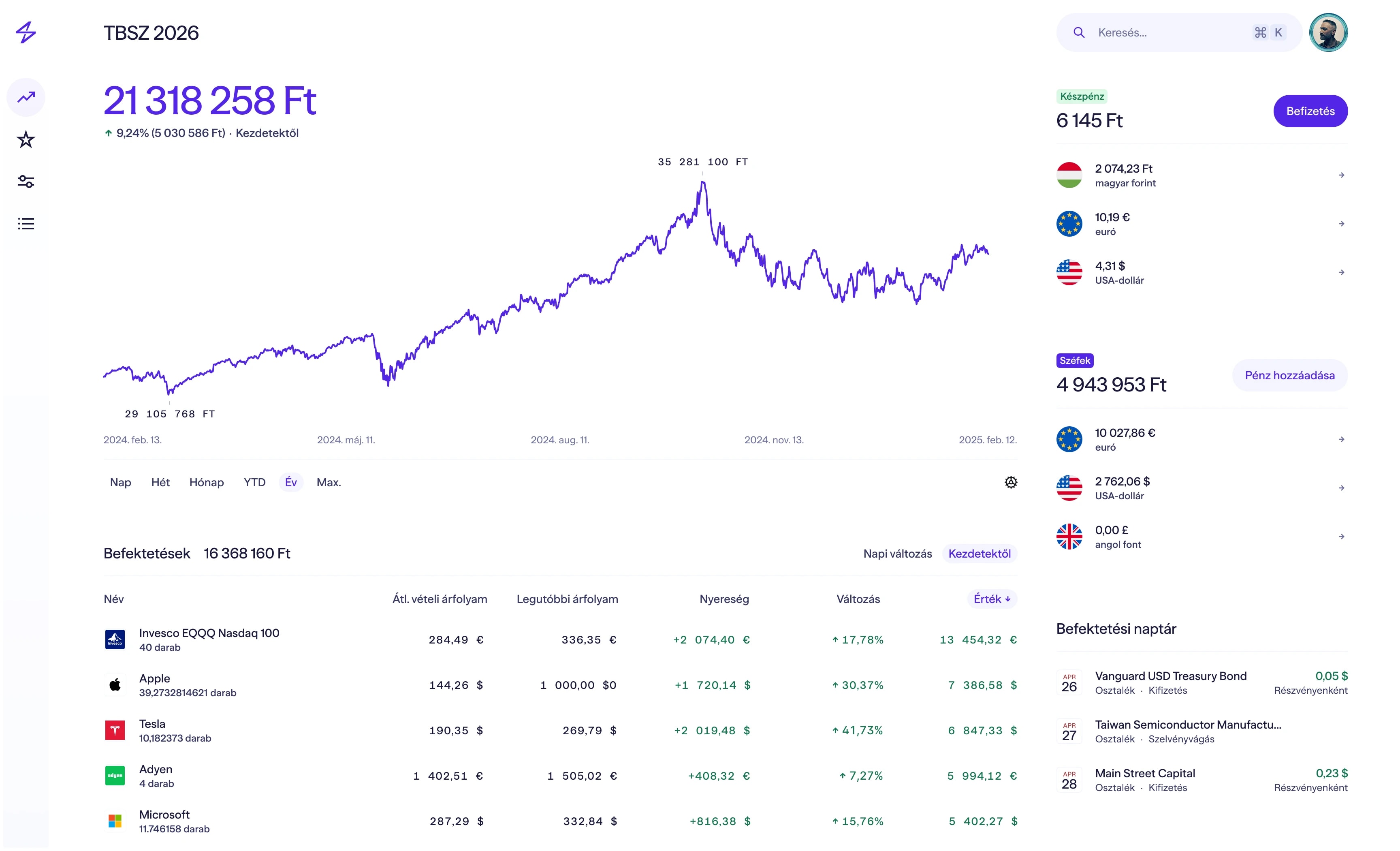 Nincs végrehajtási és számlavezetési díj. És nincs átváltási díj sem, ha a saját devizádban jegyzett ETF-ekbe fektetsz be. Max. 1 EUR / USD / GBP tranzakciós díj az egyedi részvények esetében.